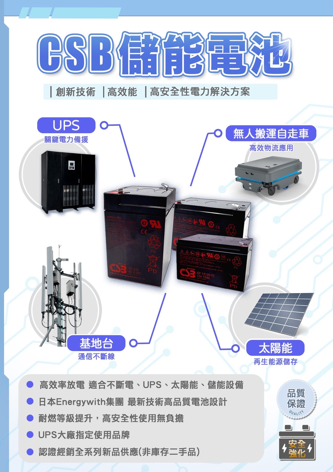 採用密閉鉛酸電池設計,具高穩定性、使用壽命長的特點,適用於多種設備系統。