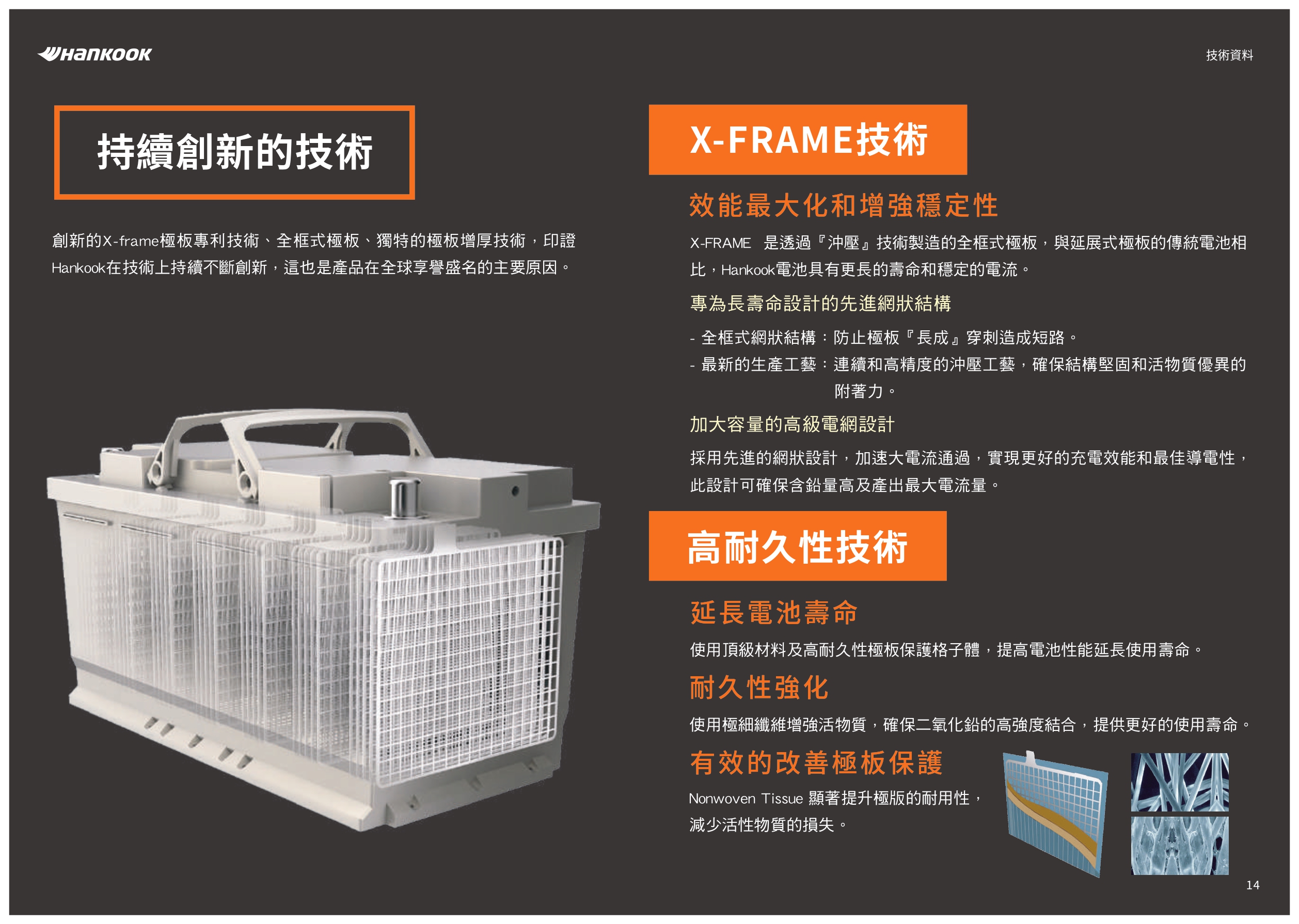 採用X-Frame極板並增加碳元素極細纖維板,提升電池使用壽命。